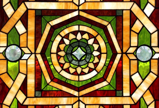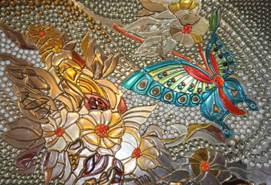 – объемный рисунок создается из ограненных кусочков цветного и прозрачного стекла.