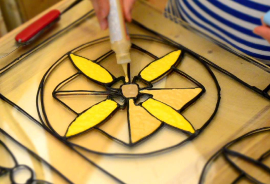 – на стеклянную основу наклеивается витражная пленка, которая обводится контуром 3.5 мм (дублируется на обратной стороне).