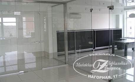 Изготавливаются с применением гнутого (моллированного) закаленного стекла. Конструкции могут быть распашными (функционируют как обычная дверь) и откатными (для установки используется рельс в виде трубки из нержавеющей стали).
