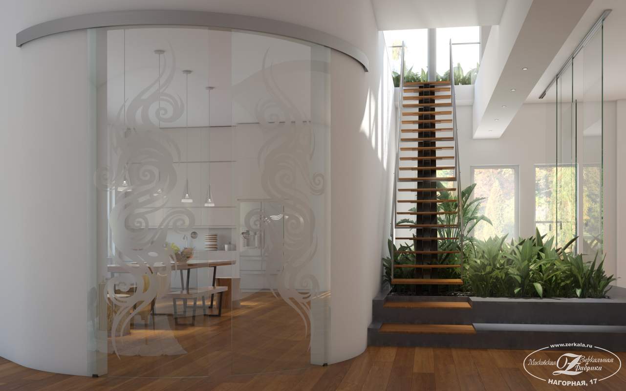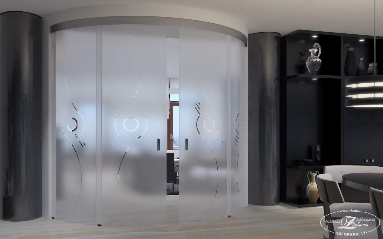 Радиусные стеклянные двери (изогнутые двери) изготавливаются с применением гнутого (моллированного) закаленного стекла. Радиусные стеклянные двери бывают откатными и распашными. Откатные радиусные двери могут сочетаться только с теми системами фурнитуры, рельс которых представлен в виде трубки из нержавеющей стали.Такую трубку можно согнуть под произвольным радиусом. Радиусные стеклянные двери (изогнутые двери) применяют для душевых кабин и в эксклюзивных частных интерьерах.